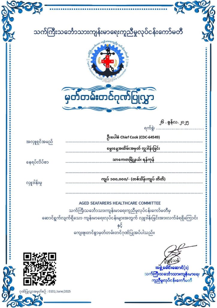 ASHC ရန်ပုံငွေ ထည့်လှူခြင်း🙏🙏🙏**********************************ရန်ကုန်မြို့ ၊ သာကေတ မြို့နယ်နေ Chief Cook ဦးပေါစံ (CDC-64549) ၏ မွေးနေ့အထိမ်းအမှတ် အလှူအဖြစ် သက်ကြီးသင်္ဘောသားကျန်းမာရေးကူညီမှုလုပ်ငန်းကော်မတီ သို့ အလှူငွေ တစ်သိန်းကျပ် တိတိကိုထည့်ဝင်လှူဒါန်းခဲ့ပါသည်။မွေးနေ့အလှူရှင်ဦးပေါစံနှင့် မိသားစုဝင်များအနေဖြင့် သာဓု အနုမောဓနာ ခေါ်ဆိုနိုင်ကြပါစေ။ စိတ်ချမ်းသာ ကိုယ်ကျန်းမာ ကောင်းမြတ်သော လိုအင်ဆန္ဒများနှင့် ပြည့်စုံကြပါစေ။ကပ်ကြီးသုံးပါးမှလည်းလွတ်ကင်းကျော်လွှားနိုင်ကြပါစေ။ လုပ်ငန်းကိုင်ငန်းများလည်း အဆင်ပြေချောမွေ့အောင်မြင်ကြပြီး ဒီထက်မကလည်းပိုမို လှူဒါန်းနိုင်ကြပါစေ။🙏🙏🙏အလှူရှင်များ ပေးပို့လာသော အလှူတော်ဒါနများကို လက်ရှိကျန်းမာရေးအတွက် အထူးအကူအညီလိုအပ်နေသောသင်္ဘောသားကြီး/ငယ် များလက်ဝယ်သို့ ဆိုက်ဆိုက် မြိုက်မြိုက် ရောက်ရှိအောင် ASHC မှ ကိုယ်တိုင်ကိုယ်ကျ သွားရောက်လှူဒါန်းပေးလျှက်ရှိပါသည်။ ရှေ့ဆက်လည်းအစွမ်းကုန်ကြိုးစားပေးကြပါမည်။ဆက်သွယ်လှုဒါန်းလို၍ဖြစ်စေ၊ အကူညီတောင်းခံလို၍ဖြစ်စေ အောက်ပါလိပ်စာနဲ့ ဖုန်းနံပါတ်ကို ဆက်သွယ်နိုင်ပါသည် ရုံးခန်းလိပ်စာ – အမှတ်-70 ပထမထပ်၊ ရေကျော်လမ်းမ၊ ပုဇွန်တောင်မြို့နယ်၊ ရန်ကုန်။ဖုန်းနံပါတ် – 09793796486 (Office)095112325 (Hotline)Website page ဖြစ်တဲ့ https://ashcmm.org တွင်လည်း ၀င်ရောက်ကြည့်ရှုနိုင်ပါတယ်ခင်ဗျာASHC26th June 2025