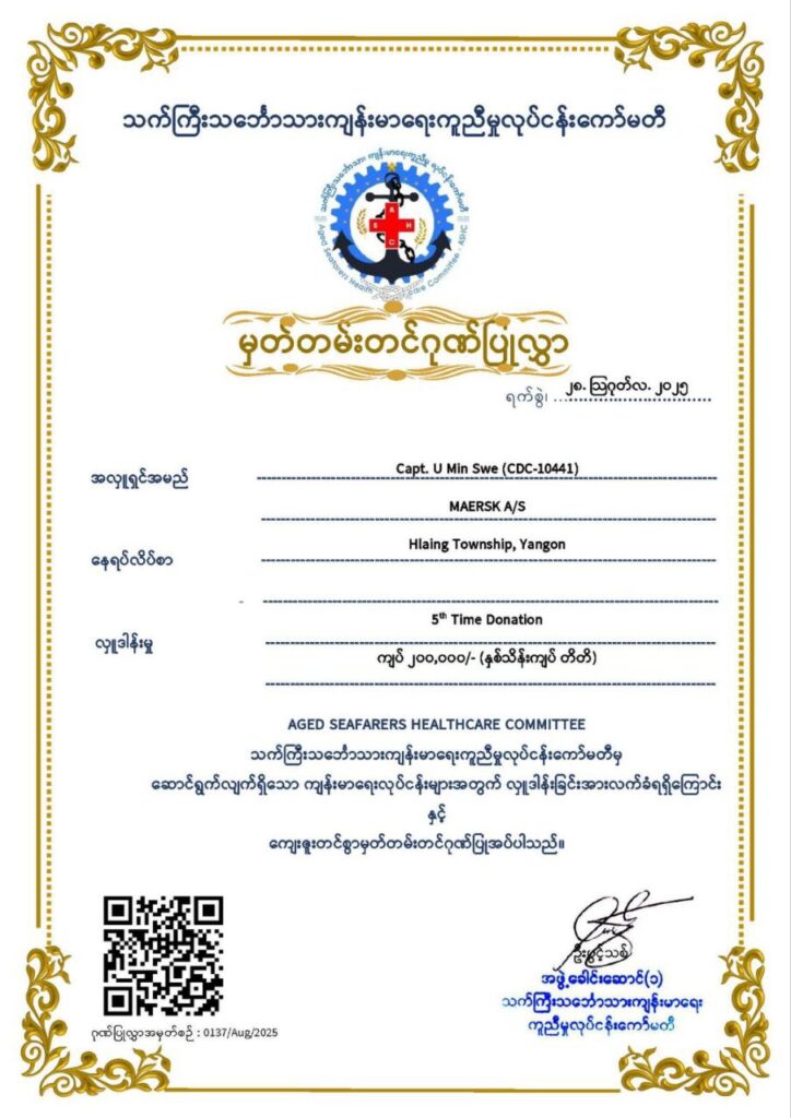 သက်ကြီးသင်္ဘောသားကျန်းမာရေးကူညီမှုလုပ်ငန်းကော်မတီ ရန်ပုံငွေအတွက်