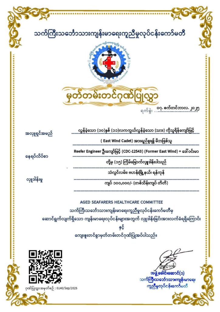 ASHC ရန်ပုံငွေ (၁၅) ကြိမ် မြောက် ထည့်လှူခြင်း😊😊😊************************************သက်ကြီးသင်္ဘောသားကျန်းမာရေးကူညီမှုလုပ်ငန်းကော်မတီ ရန်ပုံငွေအတွက် ရန်ကုန်မြို့၊ဗဟန်းမြို့နယ်နေ လွန်ခဲ့သော (၁၀)နှစ်( ၁၁ )လ က ကွယ်လွန်သွားခဲ့သော (သား) ကိုသူရိန်ကျော်မြင့် (East Wind Cadet ) အား ရည်စူး၍ မိဘဖြစ်သူ Reefer Engineer ဦးကျော်မြင့် (CDC-12543) Former East Wind + ဒေါ်၀င်းမာ မိသားစုမှ အလှူငွေ တစ်သိန်းကျပ်တိတိ ကို တစ်ဆယ့်ငါးကြိမ်မြောက် အလှူဒါနအ​​ဖြစ်​ပါဝင်လှူဒါန်းသွားပါတယ် ခင်ဗျာ။🙏🙏🙏အလှူရှင် ဦးကျော်မြင့်+ဒေါ်ဝင်းမာ မိသားစုများအနေဖြင့်2024ခုနှစ်တွင် ငါး ကြိမ် လှူဒါန်းခဲ့ပြီး လှူဒါန်းငွေစုစုပေါင်း ငါးသိန်းကျပ်(07.01.2025) ရက်နေ့တွင် ဆဋ္ဌမအကြိမ် တစ်သိန်းကျပ်(07.02.2025) ရက်နေ့တွင် သတ္တမအကြိမ် တစ်သိန်းကျပ် (07.03.2025) ရက်နေ့တွင် အဌမအကြိမ် တစ်သိန်းကျပ်(07.04.2025) ရက်နေ့တွင် နဝမအကြိမ် တစ်သိန်းကျပ်(07.05.2025) ရက်နေ့တွင် ဆယ်ကြိမ်မြောက်တစ်သိန်းကျပ်(01.06.2025) ရက်နေ့တွင် (၁၁) ကြိမ်မြောက်တစ်သိန်းကျပ်(07.06.2025) ရက်နေ့တွင် (၁၂) ကြိမ်မြောက်တစ်သိန်းကျပ် (07.07.2025) ရက်နေ့တွင် (၁၃) ကြိမ်မြောက် တစ်သိန်းကျပ်၊ (07.08.2025) ရက်နေ့တွင် (၁၄) ကြိမ်မြောက် တစ်သိန်းကျပ်၊ ယခု (07.09.2025) ရက်နေ့တွင် (၁၅) ကြိမ်မြောက် တစ်သိန်းကျပ်၊ စုစုပေါင်း တစ်ဆယ့်ငါးသိန်းကျပ် တိတိကို ပါ၀င်လှူဒါန်းပြီးဖြစ်ပါသည် ခင်ဗျာ 🙏🙏🙏လွန်ခဲ့သော (၁၀)နှစ်( ၁၁ )လ က ကွယ်လွန်သွားသူ (သား) ကိုသူရိန်ကျော်မြင့် နှင့် တကွ အလှူရှင်မိသားစုဝင်များအနေဖြင့် သာဓု အနုမောဓနာ ခေါ်ဆိုနိုင်ကြပါစေ။ စိတ်ချမ်းသာ ကိုယ်ကျန်းမာ ကောင်းမြတ်သော လိုအင်ဆန္ဒများနှင့် ပြည့်စုံကြပါစေ။ကပ်ကြီးသုံးပါးမှလည်းလွတ်ကင်းကျော်လွှားနိုင်ကြပါစေ။ လုပ်ငန်းကိုင်ငန်းများလည်း အဆင်ပြေချောမွေ့အောင်မြင်ကြပြီး ဒီထက်မကလည်းပိုမို လှူဒါန်းနိုင်ကြပါစေ။🙏🙏🙏အလှူရှင်များ ပေးပို့လာသော အလှူတော်ဒါနများကို လက်ရှိကျန်းမာရေးအတွက် အထူးအကူအညီလိုအပ်နေသောသင်္ဘောသားကြီး/ငယ် များလက်ဝယ်သို့ ဆိုက်ဆိုက် မြိုက်မြိုက် ရောက်ရှိအောင် ASHC မှ ကိုယ်တိုင်ကိုယ်ကျ သွားရောက်လှူဒါန်းပေးလျှက်ရှိပါသည်။ ရှေ့ဆက်လည်းအစွမ်းကုန်ကြိုးစားပေးကြပါမည်။ဆက်သွယ်လှုဒါန်းလို၍ဖြစ်စေ၊ အကူညီတောင်းခံလို၍ဖြစ်စေ အောက်ပါလိပ်စာနဲ့ ဖုန်းနံပါတ်ကို ဆက်သွယ်နိုင်ပါသည် ရုံးခန်းလိပ်စာ – အမှတ်-70 ပထမထပ်၊ ရေကျော်လမ်းမ၊ ပုဇွန်တောင်မြို့နယ်၊ ရန်ကုန်။ဖုန်းနံပါတ် – 09793796486 (Office)095112325 (Hotline)Website page ဖြစ်တဲ့ https://ashcmm.org တွင်လည်း ၀င်ရောက်ကြည့်ရှုနိုင်ပါတယ်ခင်ဗျာASHC07th September 2025