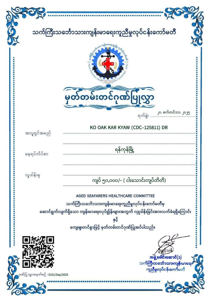 ASHC ရန်ပုံငွေ ထည့်လှူခြင်း😊😊😊************************************သက်ကြီးသင်္ဘောသားကျန်းမာရေးကူညီမှုလုပ်ငန်းကော်မတီ ရန်ပုံငွေအတွက် KO OAK KAR KYAW (CDC-125811) DR မှ အလှူငွေကျပ် ငါးသောင်းကျပ်တိတိကို ပါဝင်လှူဒါန်းသွားပါတယ် ခင်ဗျာ။ အလှူရှင်နှင့်မိသားစုဝင်များအနေဖြင့် သာဓု အနုမောဓနာ ခေါ်ဆိုနိုင်ကြပါစေ။ စိတ်ချမ်းသာ ကိုယ်ကျန်းမာ ကောင်းမြတ်သော လိုအင်ဆန္ဒများနှင့် ပြည့်စုံကြပါစေ။ကပ်ကြီးသုံးပါးမှလည်းလွတ်ကင်းကျော်လွှားနိုင်ကြပါစေ။ လုပ်ငန်းကိုင်ငန်းများလည်း အဆင်ပြေချောမွေ့အောင်မြင်ကြပြီး ဒီထက်မကလည်းပိုမို လှူဒါန်းနိုင်ကြပါစေ။🙏🙏🙏အလှူရှင်များ ပေးပို့လာသော အလှူတော်ဒါနများကို လက်ရှိကျန်းမာရေးအတွက် အထူးအကူအညီလိုအပ်နေသောသင်္ဘောသားကြီး/ငယ် များလက်ဝယ်သို့ ဆိုက်ဆိုက် မြိုက်မြိုက် ရောက်ရှိအောင် ASHC မှ ကိုယ်တိုင်ကိုယ်ကျ သွားရောက်လှူဒါန်းပေးလျှက်ရှိပါသည်။ ရှေ့ဆက်လည်းအစွမ်းကုန်ကြိုးစားပေးကြပါမည်။ဆက်သွယ်လှုဒါန်းလို၍ဖြစ်စေ၊ အကူညီတောင်းခံလို၍ဖြစ်စေ အောက်ပါလိပ်စာနဲ့ ဖုန်းနံပါတ်ကို ဆက်သွယ်နိုင်ပါသည် ရုံးခန်းလိပ်စာ – အမှတ်-70 ပထမထပ်၊ ရေကျော်လမ်းမ၊ ပုဇွန်တောင်မြို့နယ်၊ ရန်ကုန်။ဖုန်းနံပါတ် – 09793796486 (Office)095112325 (Hotline)Website page ဖြစ်တဲ့ https://ashcmm.org တွင်လည်း ၀င်ရောက်ကြည့်ရှုနိုင်ပါတယ်ခင်ဗျာASHC20th September 2025