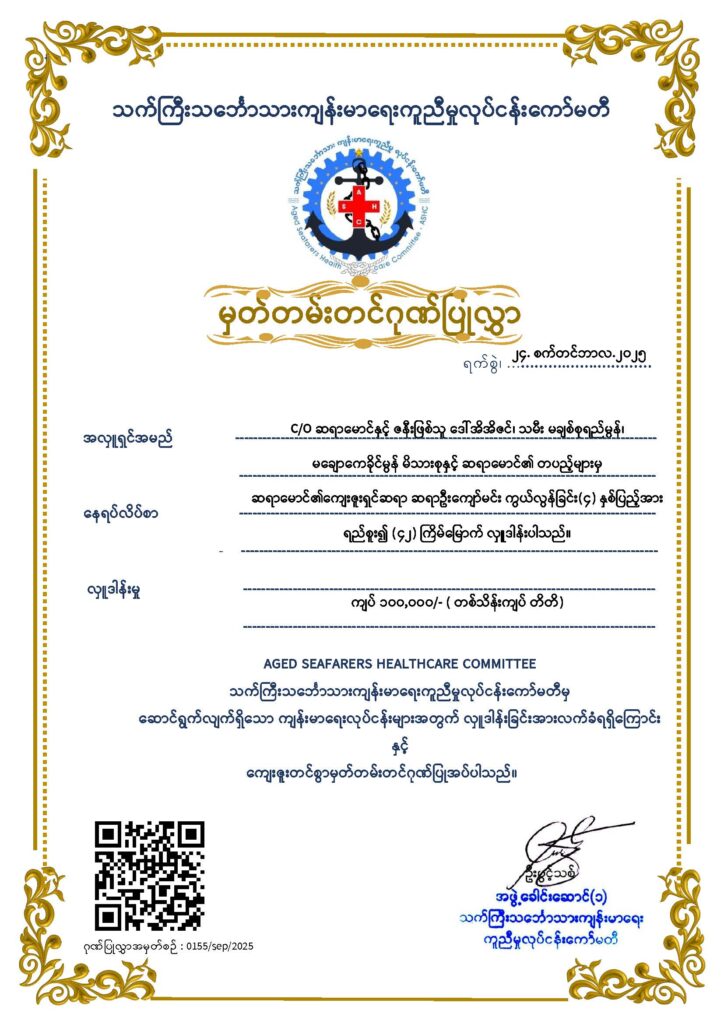 ASHC ရန်ပုံငွေ (၄၂)ကြိမ်မြောက်ထည့်လှူခြင်း😊😊😊*******************************************သက်ကြီးသင်္ဘောသားကျန်းမာရေးကူညီမှုလုပ်ငန်းကော်မတီ ရန်ပုံငွေအတွက် လစဥ် စဥ်ဆက်မပြတ်လှူ ဒါန်းပေးနေကြဖြစ်သောတာမွေမြို့နယ်၊ ရန်ကုန်တွင် နေထိုင်သည့် Chief Officer ဦးမောင်မောင်အောင် (CDC-16580) + ဇနီးဖြစ်သူ ဒေါ်အိအိဇင်၊ သမီး မချစ်စုရည်မွန်၊မချောကေခိုင်မွန် မိသားစုနှင့် ဆရာ မောင်၏ တပည့်များမှ ဆရာမောင်၏ ကျေးဇူးရှင်ဆရာဖြစ်သူ ဆရာဦးကျော်မင်းကွယ်လွန်ခြင်း (၄)နှစ်ပြည့် အားရည်စူးအလှူအဖြစ် အလှူငွေကျပ်တစ်သိန်းတိတိကို (၄၂ )ကြိမ်မြောက်အလှူဒါနအဖြစ်ပါဝင်လှူဒါန်းသွားပါတယ် ခင်ဗျာ။ 🙏🙏🙏ဆရာ ဦးမောင်မောင်အောင်မိသားစုနှင့် တပည့်များမှ2022 ခုနှစ်တွင် (၁၀)ကြိမ်လှူဒါန်းခဲ့ပြီး လှူဒါန်းငွေ စုစုပေါင်း တစ်ဆယ်သိန်းကျပ်၊2023 ခုနှစ်တွင် (၁၁)ကြိမ်လှူဒါန်းခဲ့ပြီး လှူဒါန်းငွေ စုစုပေါင်း တစ်ဆယ့်တစ်သိန်းကျပ်၊2024 ခုနှစ်တွင် (၁၂) ကြိမ်လှူဒါန်းခဲ့ပြီး လှူဒါန်းငွေ စုစုပေါင်း တစ်ဆယ့်နှစ်သိန်းကျပ်၊(10.01.2025) ရက်နေ့တွင် (၃၄)ကြိမ်မြောက် တစ်သိန်းကျပ်၊(28.02.2025) ရက်နေ့တွင် (၃၅)ကြိမ်မြောက် တစ်သိန်းကျပ်(20.03.2025) ရက်နေ့တွင် (၃၆) ကြိမ်မြောက်တစ်သိန်းကျပ် (26.04.2025) ရက်နေ့တွင် (၃၇) ကြိမ်မြောက်တစ်သိန်းကျပ်(23.05.2025) ရက်နေ့တွင် (၃၈) ကြိမ်မြောက် တစ်သိန်းကျပ် (11.06.2025) ရက်နေ့တွင် (၃၉)ကြိမ်မြောက် တစ်သိန်းကျပ်(13.07.2025) ရက်နေ့တွင် (၄၀)ကြိမ်မြောက် တစ်သိန်းကျပ်(28.08.2025) ရက်နေ့တွင် (၄၁)ကြိမ်မြောက် တစ်သိန်းကျပ်ယခု (24.09.2025) ရက်နေ့တွင် (၄၂)ကြိမ်မြောက် တစ်သိန်းကျပ်စုစုပေါင်း လေးဆယ့်နှစ်သိန်း ကျပ် တိတိကို ထည့်၀င်လှူဒါန်းခဲ့ပြီးဖြစ်ပါသည်။😊 ဤကောင်းမှုကုသိုလ်များအား ကွယ်လွန်သူ အစ်ကို၊ အစ်မ များသည် မြင့်မြတ်ရာဘုံဘဝကနေ သာဓုအနုမောဓနာခေါ်ဆိုနိုင်ကြပါစေ 🙏🙏🙏အလှူရှင်ဆရာမောင်နှင့် မိသားစု၀င်များ၊ တပည့်များအနေဖြင့် သာဓု အနုမောဓနာ ခေါ်ဆိုနိုင်ကြပါစေ။ စိတ်ချမ်းသာ ကိုယ်ကျန်းမာ ကောင်းမြတ်သောလိုအင်ဆန္ဒတွေနဲ့ ပြည့်စုံကြပါစေ။ သင်တန်းကျောင်းလည်း ယခုထက်မကအောင်မြင်တိုးတက်ပါစေ။ ကပ်ကြီးသုံးပါးမှလည်းလွတ်ကင်းကျော်လွှားနိုင်ကြပါစေ။ လုပ်ငန်းကိုင်ငန်းများလည်း အဆင်ပြေချောမွေ့အောင်မြင်ကြပြီး ဒီထက်မကလည်းပိုမို လှူဒါန်းနိုင်ကြပါစေ။🙏🙏🙏အလှူရှင်များ ပေးပို့လာသော အလှူတော်ဒါနများကို လက်ရှိကျန်းမာရေးအတွက် အထူးအကူအညီလိုအပ်နေသောသင်္ဘောသားကြီး/ငယ် များလက်ဝယ်သို့ ဆိုက်ဆိုက် မြိုက်မြိုက် ရောက်ရှိအောင် ASHC မှ ကိုယ်တိုင်ကိုယ်ကျ သွားရောက်လှူဒါန်းပေးလျှက်ရှိပါသည်။ ရှေ့ဆက်လည်းအစွမ်းကုန်ကြိုးစားပေးကြပါမည်။ဆက်သွယ်လှုဒါန်းလို၍ဖြစ်စေ၊ အကူညီတောင်းခံလို၍ဖြစ်စေ အောက်ပါလိပ်စာနဲ့ ဖုန်းနံပါတ်ကို ဆက်သွယ်နိုင်ပ