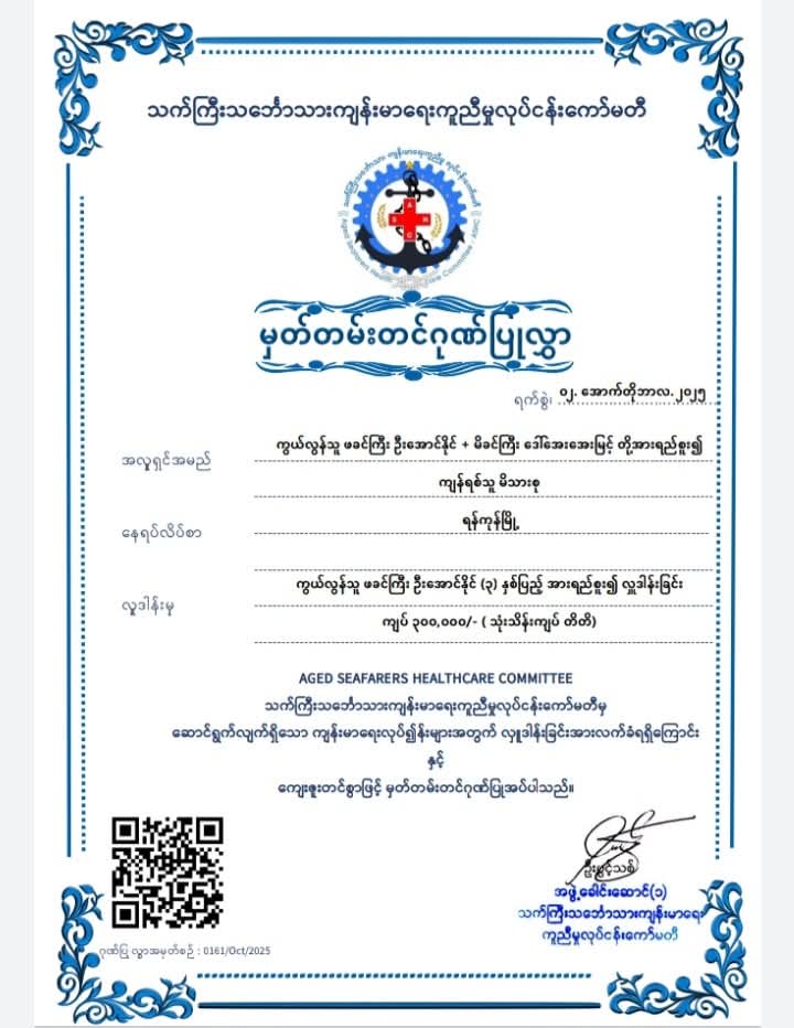 ASHC ရန်ပုံငွေ ထည့်လှူခြင်း🙏🙏🙏************************************ကွယ်လွန်သူ ဖခင်ကြီး MPE ဦးအောင်နိုင်( ခ) ဗိုလ်မုတ် (စက်ကြပ်) + ကွယ်လွန်သူမိခင်ကြီး မိခင်ကြီး ဒေါ်အေးအေးမြင့်တို့အားရည်စူး၍ ကျန်ရစ်သူမိသားစုမှ ကွယ်လွန်သူဖခင်ကြီး ဦးအောင်နိုင် (၃)နှစ်ပြည့်အလှူအဖြစ် သက်ကြီးသင်္ဘောသားကျန်းမာရေးကူညီမှုလုပ်ငန်းကော်မတီ သို့ အလှူငွေ သုံး သိန်းကျပ် တိတိကိုထည့်ဝင်လှူဒါန်းခဲ့ပါသည်။ယခုလှူဒါန်းမှုအား ကွယ်လွန်သူဦးအောင်နိုင် နှင့် မိခင်ကြီး ဒေါ်အေးအေးမြင့်တို့ သည် မြင့်မြတ်ရာဘုံဘဝမှ သာဓုအနုမောဓနာခေါ်ဆိုနိုင်ပါစေခင်ဗျာ🙏🙏🙏အလှူရှင်များနှင့် မိသားစုဝင်များအနေဖြင့် သာဓု အနုမောဓနာ ခေါ်ဆိုနိုင်ကြပါစေ။ စိတ်ချမ်းသာ ကိုယ်ကျန်းမာ ကောင်းမြတ်သော လိုအင်ဆန္ဒများနှင့် ပြည့်စုံကြပါစေ။ကပ်ကြီးသုံးပါးမှလည်းလွတ်ကင်းကျော်လွှားနိုင်ကြပါစေ။ လုပ်ငန်းကိုင်ငန်းများလည်း အဆင်ပြေချောမွေ့အောင်မြင်ကြပြီး ဒီထက်မကလည်းပိုမို လှူဒါန်းနိုင်ကြပါစေ။🙏🙏🙏အလှူရှင်များ ပေးပို့လာသော အလှူတော်ဒါနများကို လက်ရှိကျန်းမာရေးအတွက် အထူးအကူအညီလိုအပ်နေသောသင်္ဘောသားကြီး/ငယ် များလက်ဝယ်သို့ ဆိုက်ဆိုက် မြိုက်မြိုက် ရောက်ရှိအောင် ASHC မှ ကိုယ်တိုင်ကိုယ်ကျ သွားရောက်လှူဒါန်းပေးလျှက်ရှိပါသည်။ ရှေ့ဆက်လည်းအစွမ်းကုန်ကြိုးစားပေးကြပါမည်။ဆက်သွယ်လှုဒါန်းလို၍ဖြစ်စေ၊ အကူညီတောင်းခံလို၍ဖြစ်စေ အောက်ပါလိပ်စာနဲ့ ဖုန်းနံပါတ်ကို ဆက်သွယ်နိုင်ပါသည် ရုံးခန်းလိပ်စာ – အမှတ်-70 ပထမထပ်၊ ရေကျော်လမ်းမ၊ ပုဇွန်တောင်မြို့နယ်၊ ရန်ကုန်။ဖုန်းနံပါတ် – 09793796486 (Office)095112325 (Hotline)Website page ဖြစ်တဲ့ https://ashcmm.org တွင်လည်း ၀င်ရောက်ကြည့်ရှုနိုင်ပါတယ်ခင်ဗျာASHC02th October 2025