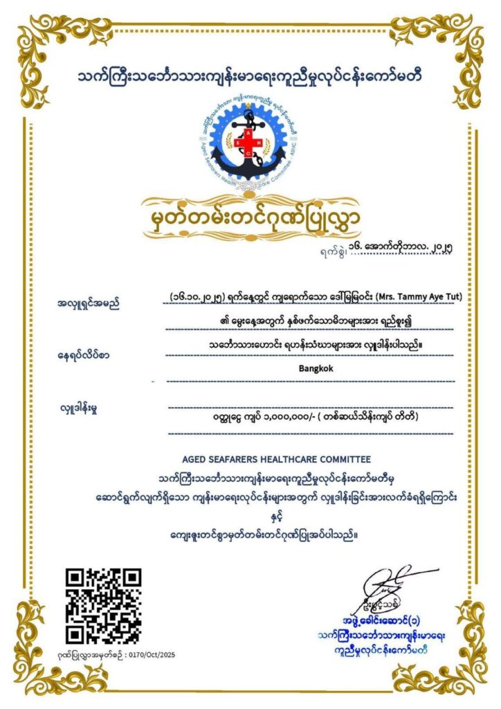 အလှူရှင်များ ပေးပို့လာသော အလှူတော်ဒါနများကို လက်ရှိကျန်းမာရေးအတွက် အထူးအကူအညီလိုအပ်နေသောသင်္ဘောသားကြီး/ငယ် များလက်ဝယ်သို့ ဆိုက်ဆိုက် မြိုက်မြိုက် ရောက်ရှိအောင် ASHC မှ ကိုယ်တိုင်ကိုယ်ကျ သွားရောက်လှူဒါန်းပေးလျှက်ရှိပါသည်။